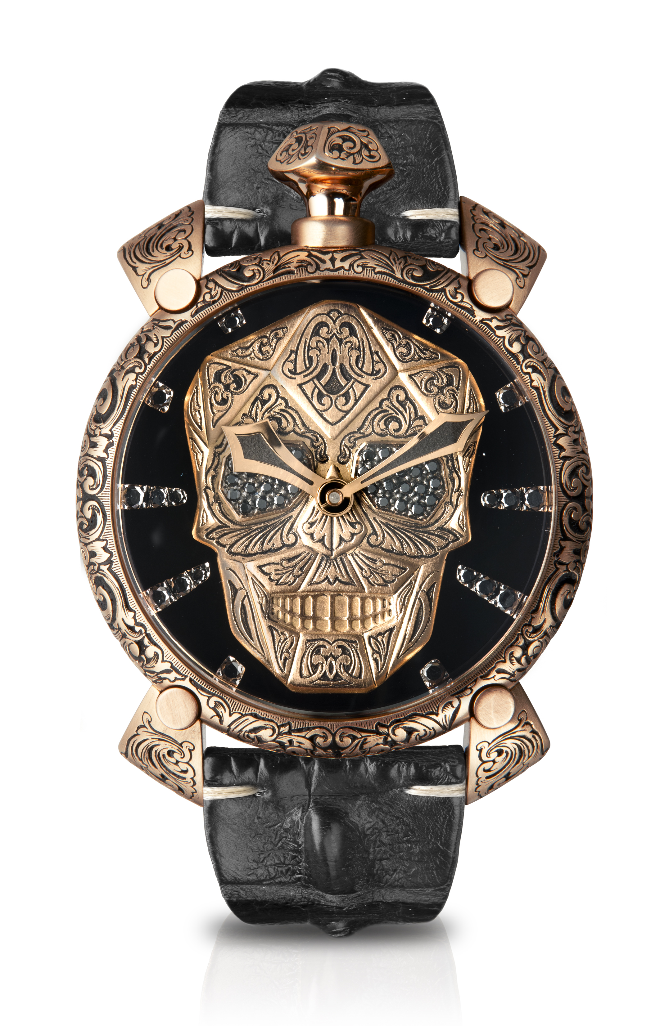 Più gentili gli Skullpture di Gagà, cassa ø 46 mm in acciaio con inserti in oro, o in oro rosa come le lancette e gli indici sul quadrante; questo è smaltato e la cassa è incisa con molta maestria. il movimento svizzero meccanico e a carica manuale.