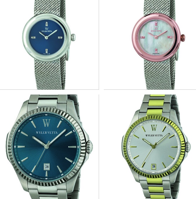 In quanto agli iconici Wyler Vetta, nella foto sopra, sono da mettere in risalto i nuovi orologi delle collezioni Club e Luce. Nella prima modelli maschili cassa in acciaio e bracciale analogo (anche IP gold) ø 40 mm (ø 32 per il modello femminile) quadrante blu o bianco, lunetta zigrinata, movimento Ronda cal.515,1. Gli eleganti femminili Luce hanno casse in acciaio ø 26 mm, quadrante madreperla bianco o con 4 borchie IP oro rosa o IP light gold come il logo e 4 diamanti bianchi, movimento Ronda cal 751.2 il morbido bracciale in maglia mesh è particolarmente brillante.