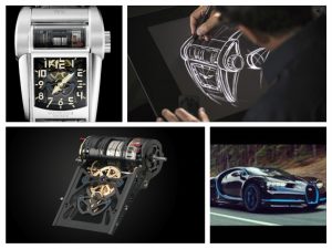 PARMIGIANI – Dopo 4 anni di studio è stata presentata in autunno l’edizione limitata (10 esemplari in oro bianco e 10 in oro rosa) del nuovo Bugatti Type 390 ispirato alla Bugatti Chiron (vista da Pisa in giugno) dalle prestazioni d’avanguardia (raggiunge i 500 km/h). Il movimento (25,5×37,5 mm) sviluppato su sette strati riunisce 302 componenti; è il nuovo calibro meccanico cilindrico trasversale PF390 con tourbillon volante, collegato al quadrante da una vite scena fine; l’energia viene trasmessa con ingranaggi epicicloidali. Atokalpa, azienda del Gruppo Parmigiani produce il bilanciere a inerzia variabile e la spirale Breguet; la riserva di carica è indicata con una costruzione inedita. Sono stati chiesti brevetti per l’accoppiamento triangolare dei due bariletti e per la cassa (42,2X57,7 mm) che ruota a 12°, realizzata da Les Artisan Boitiers sempre della Manifattura Parmigiani e che permette attraverso 4 vetri zaffiro di ammirare il movimento .