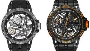 ROGER DUBUIS – L’interesse suscitato dagli Excalibur nelle versioni legate al mondo dei motori ha portato a nuovi orologi, svelati a fine dicembre, imponenti per la cassa ø 45 mm e ovviamente con Punzone di Ginevra. Tutto nero l’automatico scheletrato Excalibur Spider Pirelli (88 esemplari) con cassa in titanio DLC, movimento RD820SQ con microrotore scheletrato, A/h 28.800, 35 rubini. Per gli appassionati dei dettagli curiosi nel cinturino sono inseriti frammenti di pneumatici che hanno partecipato a gare sui circuiti, mentre l’interno riproduce il disegno di un battistrada, Per la squadra corse Lamborghini l’Excalibur Aventador S , sempre con cassa Spider, vede tre versioni, 28 esemplari hanno cassa in carbonio multistrato, carrube in titanio sovrastampata in caucciù nero, lunetta in oro rosa, movimento manuale Calibro RD103SQ doppi bilancieri a spirale scheletrati, 48 rubini, frequenza 2×4 Hertz 57.600 alternanze/ora; 88 gli esemplari con carrube in titanio e caucciù sovrastampato giallo; infine solo 8 quelli con cassa in carbonio C-SMC e carrube dove predomina il colore arancione e che nella foto appare più grande dello Spider Pirelli. Cinturini rispettivamente con base di caucciù e inserto in Alcantara nero con cuciture dorate, con inserto rubber-tech nero con cuciture gialle e infine inserto in Alcantara nero e cuciture arancione.