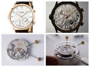 Dal retro dell’orologio Peacock di Fabergé si possono vedere gli elementi che consentono al pavone di fare la ruota; sul quadrante una fascia esterna ruota e indica le ore mentre le piume della coda si aprono a ventaglio indicando i minuti di 15 in 15 per poi tornare a retrograde; non a caso l’orologio ha ottenuto il premio Lady high mechanic al GPHG del 2015, qui pubblichiamo la più recente versione con il quadrante nero. Oltre ai moduli che completano un movimento di base, e che non sempre vengono indicati come opere di Agenhor, Jean Marc ha realizzato anche movimenti completi. Gli abbiamo chiesto quale delle sue opere fosse la preferita, fermo restando che per un padre tutti i figli sono uguali (o dovrebbero esserlo) e la risposta è stata inaspettata, l’orologio al quale è più legato è il cronografo interpretato in modo inedito, un lavoro che lo ha impegnato per una decina di anni. Qui apriamo una parentesi perché il quadrante del cronografo, dopo l’idea di Nicole Rieussec, ripresa pochi anni or sono da Montblanc, vede generalmente due o tre contatori, fa eccezione per la sua originalità il Chrono4 di Eberhard ideato da Palmiro Monti con i contatori in linea che facilitano la lettura del tempo cronografato; Jean Marc invece ha pensato per il suo Chronographe Visionnaire a indicazioni concentriche che si sviluppano intorno al punto focale.
