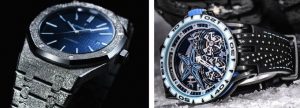Ma ci sono anche tecniche artigianali finalizzate all’estetica. Roger Dubuis nell’Excalibur Spider Pirelli Sottozero (cassa in titanio e vetro zaffiro ø 47 mm, lunetta in ceramica bianca, movimento Calibro RD105SQ, carica manuale con dettagli blu e scappamento con doppio tourbillon volante) ricrea l’impressione del ghiaccio; il cinturino in caucciù incorpora frammenti di pneumatici Pirelli certificati ed è completato da borchie in titanio. Audemars Piguet ha proposto nel 2916 il Royal Oak “frosted”, una tecnica artigianale che con una punta di diamante crea minuscoli incavi nella superficie dell’oro giallo facendogli assumere visivamente un aspetto ghiacciato e quest’anno lo propone in oro bianco con cassa ø 41 mm e tiratura di 200 esemplari..