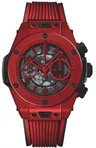 Quello però che stupisce in questa scelta di rinnovamento dei materiali è la ricerca del colore non solo sul quadrante, ma anche su lunette, corone, pulsanti dei cronografi e cinturini, a testimonianza che il fattore estetico è diventato molto importante. In questo campo in pole position troviamo Richard Mille, Roger Dubuis e Hublot; quest’ultimo, come anteprima di Baselworld 2018 presenta il cronografo automatico flyback con ruota a colonne, Unicum, con cassa, ø 45 mm w.r.100 m. in ceramica Red Magic, un colore acceso lucido ottenuto in house dopo 4 anni di studi e infine brevettata; è una ceramica sinterizzata che non brucia i pigmenti e ha un’elevata densità aumentando così la resistenza all’usura (la durezza è di 1500 HV1 rispetto ai 1200 HV2 delle ceramiche tradizionali). Il cinturino è in caucciù nero e rosso strutturato a righe. La tiratura è limitata e numerata, 500 gli esemplari