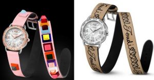 Ruotando il fondello della cassa in acciaio ø 36 mm, o bicolore placcato oro rosa con lunetta impreziosita da diamanti nel modello Open Your Heart, si cambia rapidamente (e facilmente) il cinturino. In pelle rosa con borchie multicolore nel modello Selleria Strap You, mentre è personalizzato da una scritta senza fine nell’orologio Open Your Heart; in entrambi gira due volte intorno al polso. Il movimento al quarzo è svizzero e sulla corona spicca un cabochon in madreperla.