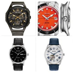 Curv Progressive Sport: ricorda il primo movimento cronografico curvo, adesso inserito in una cassa ergonomica ø 44 mm in acciaio o IP canna di fucile (analogo il bracciale), quadrante lavorato Côtes de Genève in diagonale ed al centro blu o canna di fucile, vetro zaffiro curvo a filo della lunetta, movimento brevetto Bulova. Collezione Archive Oceanographer, riedizione in tiratura limitata a 666 esemplari di un modello che negli anni ’70 ebbe un grande successo, cassa in acciaio ø 40,5 mm w.r.20 atm, lunetta girevole unidirezionale, movimento automatico Bulova, quadrante arancio come quello del passato. Wilton, automatico, indicazione riserva di carica 60 ore, movimento esclusivo Bulova fino al 2020, visibile dalla finestrella a ore 7, cassa in acciaio ø mm 42 w.r.10 atm, quadrante silver lavorato. Hanno movimento automatico giorno, data anche i modelli della collezione Clipper ø 42 mm e Sutton, per lui e per lei ø mm 42 e 34 mm, tutti in acciaio e vetro minerale piatto. Sempre per polsi femminili la collezione Rubalyat, orologi più belli dal vivo di quanto non appaiano nelle foto, cassa in acciaio inserita fra due parentesi che la allargano sino a 35 mm, quadrante in madreperla bianca con indici in diamanti per la versione in acciaio o nera per la versione IP gold, vetro zaffiro bombato, sul fondello incisione della Dea del tempo, cinturini colorati.