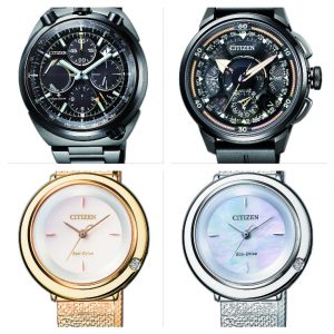 Dedicato al centenario un Satellite Wave che riceve i segnali dai satelliti e ha una tolleranza di un secondo ogni 10 milioni di anni; cassa ø 48 mm in SuperTitanio® trattato DLC; quadrante a tre livelli con finitura nera e rose gold, movimento Eco-Drive (con indicatore livello di carica e della generazione di energia, cronografo a 1/20 di secondo, secondo fuso orario, ore del mondo di 40 città, allarme). Analoga Special edition per un BullHead cronografo fly-back con allarme; sulla cassa in acciaio w.r m.200 ø 44,5 mm e analogo bracciale trattato IP canna di fucile, fondo a vite, corona e pulsanti cronografici a ore 12, a ore 5 la corona per la scala tachimetrica interna; quadrante nero, movimento Eco-Drive. Per gli amanti dei connected i modelli (anche Lady con cassa in acciaio ø 35 mm) w.r.100 m. cassa in super titanio ø 48 o 40,5 mm. Esclusivamente femminile la collezione Ambiluna ø 30 o 31.5 mm con casse in acciaio anche con finitura al platino e indici preziosi.