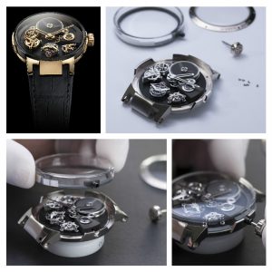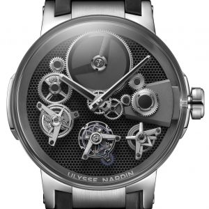 Questo tourbillon presenta caratteristiche che lo rendono speciale e non solo per la struttura del movimento. Il vetro zaffiro a cupola (altra difficoltà superata) custodisce in un cassa trasparente ø mm 44 (anche il fondo è in vetro zaffiro) una meraviglia meccanica visibile nei principali componenti. Sul quadrante in ardesia nella versione in oro rosa, o con una struttura alveolare in quella in oro bianco, si vede l’originale scappamento Ulysse Anchor presentato nel 2014 a Baselworld come alternativa a quello tradizionale svizzero ad ancora, con questa soluzione si è anche potuto eliminare il ponte dell’ancora; sul quadrante del Free Wheel spicca anche, alle 4, l’indicatore della riserva di carica di 7 giorni. Questo nuovo tourbillon si presenta quindi con tutte le carte in regola al giudizio del GPHG 2018, da notare anche che non sarà un’edizione limitata, ma entrerà nella normale produzione della Marca di Le Locle che ha realizzato in house il movimento UN-176 di Manifattura, a carica manuale con scappamento costante e tecnologia silicio.