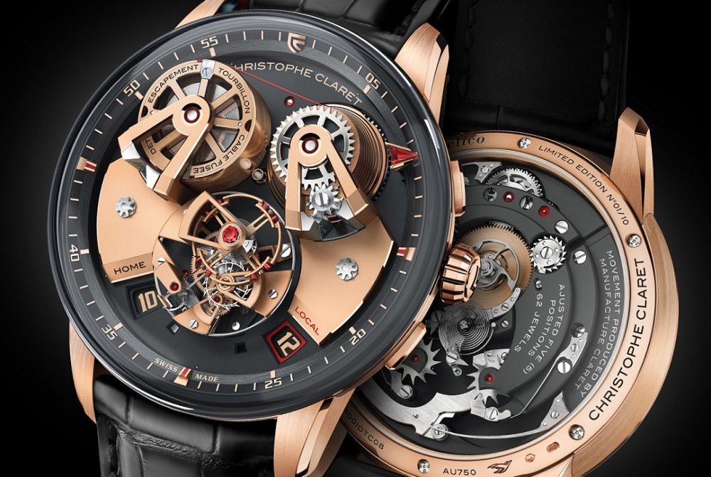 Nel 1995 nasceva il movimento per un orologio musicale che a richiesta fa ascoltare al passaggio per 15 secondi l’aria di una del 19 melodie disponibili, nel 1997, per la prima volta quell’orologio da polso reca la firma Christophe Claret. L’anno seguente arriva, nel Romeo e Giulietta, un modulo con sette automi che si muovono seguendo le note musicali. Poco dopo Claret acquista, appoggiato da un appassionato di orologi, il castello du Soleil d’Or, costruito per Urban Juergensen nel 1860, e vi trasferisce la Manifattura che continua a creare movimenti complicati per molte grandi Maison, da Ulysse Nardin a Corum a Harry Winston e tanti altri che non ne rivelano il nome. Il giovane artigiano francese, non ancora ventenne quando si era diplomato nel 1982 alla scuola di orologeria ginevrina, era diventato un imprenditore di successo famoso nel mondo per i suoi orologi dotati di complicazioni spesso innovative.