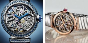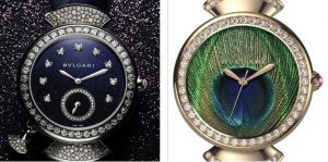 Diva’s Finissima Minute Repeater, nella foto sopra, è un modello per dieci fortunate; ha la cassa in oro bianco ø 37 mm impreziosita con diamanti incastonati a neve, fondo trasparente, movimento ultrasottile (a tutt’oggi non ne esiste un altro con spessore inferiore) Calibro BVL362 a carica manuale, ripetizione con due martelli; quadrante in avventurina blu con indici in diamanti e contatore dei secondi decentrato; per azionare la suoneria il cursore è a forma di ventaglio.Il Diva’s Pavone, a lato, rientra fra i Métiers d’Art, con il movimento automatico di Manifattura, Calibro BVL 191, cassa ø 37 mm in oro rosa, ma l’attenzione si polarizza tutta sul quadrante composto da una vera piuma di pavone.