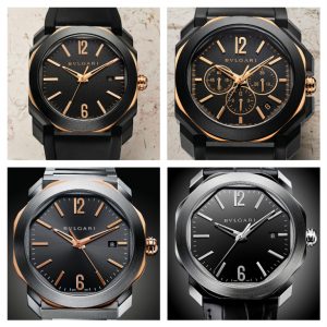 Per un pubblico più “normale”, se così possiamo definirlo pensando ai prezzi (anche se questi non sono certo accessibili a tutti), ricordiamo gli Octo Roma (in basso nella foto) con cassa in acciaio ø 41 mm, corona in acciaio con elemento in ceramica, quadrante nero con indici applicati e movimento Calibro BVL191 automatico, oppure con cassa in acciaio e oro rosa, quadrante antracite.E ancora Octo l’Originale solo tempo con movimento automatico Calibro BVL191, cassa in acciaio sabbiato trattato DLC, ottagono e corona in oro rosa; a fianco la versione cronografica con il Calibro automatico di Manifattura BVL328 e scappamento in silicio.