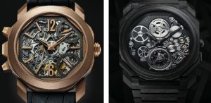 Per i polsi maschili l’Octo Grande Sonnerie, a sinistra nella foto, riprende il know how che sin dal 1994 aveva visto Gerald Genta offrire un supercomplicato riunendo, con 827 componenti, le funzioni di Grande e Piccola Suoneria, Ripetizione Minuti e scappamento a Tourbillon; ça va sans dire, commenterebbero i francesi, che siamo di fronte a un modello eccezionale che ha inserito nella moderna cassa dell’Octo le funzioni più tradizionali dell’orologeria meccanica. Il movimento di Manifattura Calibro BVL 703 automatico ha lo scappamento a tourbillon, la cassa è in oro rosa e titanio, ø 44 mm (fondello trasparente) e pesa 96,95 gr, il prezzo…? su richiesta. Solo 10 gli esemplari. Alla sua destra l’Octo Tourbillon Automatic in carbonio pesa solo 48 grammi ed è il tourbillon automatico in carbonio più sottile al mondo!