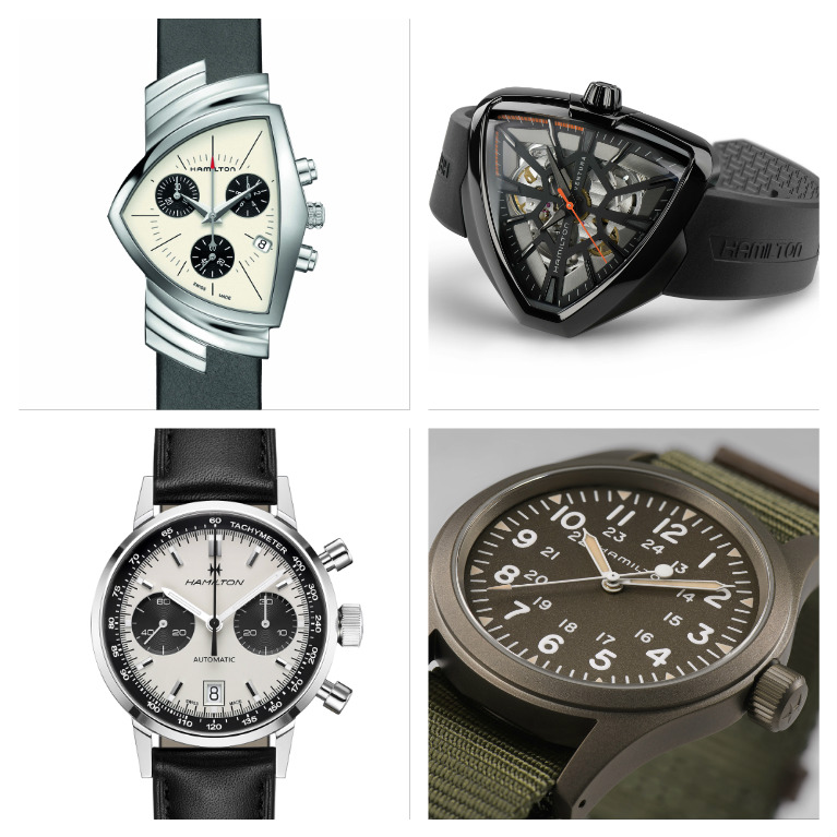 HAMILTON ha rivolto la sua attenzione sul cinema, il primo Hamilton apparve nel film Shanghai Express con Marlene Dietrich nel 1932 e da allora gli Hamilton sono stati messi in evidenza in oltre 500 film. A Milano ci sono piaciuti il Ventura Chrono Quartz, cassa in acciaio mm 32,3×50,3 con quadrante nero, la versione black scheletrata (999 esemplari) con movimento automatico H-10-5; nel 2017 lo indossava Robert Downey Jr in Spyder Man e l’intramontabile Khaki Field con movimento automatico H-50 che dispone di una riserva di carica di 80 ore e ha il quadrante verde come il cinturino in tessuto. Per gli amanti dei cronografi infine l’Intra-Matic Auto Chrono, ispirato all’estetica del Chronograph del 1968, ha un quadrante effetto Panda, bianco con contatori neri e nero con contatori avorio, movimento automatico H-31 con 60 ore di autonomia e cassa in acciaio ø 40 mm.