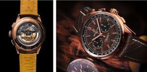 Tornando agli orologi della collezione Premier Bentley, il nuovo Premier Bentley Centenary limited edition ha la lunetta liscia mentre in passato i Breitling for Bentley erano caratterizzati dalla lunetta incisa come la mascherina del radiatore delle vetture. La cassa ø mm 42 è in oro rosso con fondello in vetro zaffiro avvitato oppure è in acciaio, w.r.10 bar, la corona non è a vite, ma ha due guarnizioni, il quadrante è in radica con contatori neri, il movimento è il Calibro di Manifattura B01 certificato cronometro dal COSC (346 i componenti), 28.800 le A/h, massa oscillante bidirezionale su cuscinetto, cronografia a 1/4 di secondo con ruota a colonne, innesto verticale.