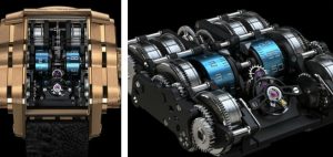 Automobile e orologio sfruttano un identico sistema di trasmissione, ma l’orologio si presenta con quella che potrebbe essere definita una marcia in più: la sua autonomia infatti raggiunge i due mesi (1400 ore di ininterrotto funzionamento) e proprio questa performance ha dato origine al nome (T2m=tempo2mesi). Realizzato con una cassa in titanio DLC 5N dall’inedito design, rivela sotto il cristallo zaffiro un eccezionale motore V8 (otto sono i bariletti) con ore e minuti che si leggono sui cilindri anodizzati, imponenti le dimensioni: mm 58,75 x 52,32; il movimento, Calibro REB T2M a carica manuale ideato in house, ha 28.800 A/h, 47 rubini, comprende 420 elementi e ovviamente è coperto da brevetto.