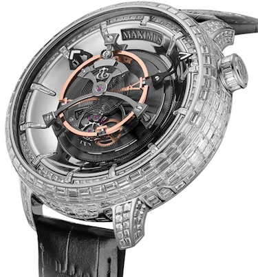 KERBEDANZ – Dopo il successo ottenuto in gennaio a Ginevra il Tourbillon Maximus Royal a Baselworld aveva una vetrina esclusiva; il nome è un omaggio al Circo Massimo romano per le dimensioni della gabbia in titanio del tourbillon centrale, ø 27 mm, che ruota in 6 minuti, per quelle della cassa, ø 51 mm (nei colori dell’oro, in platino o in titanio), ma anche per il diluvio di pietre preziose, 453 diamanti taglio baguette per oltre 18 carati; fa parte di una miniserie di 14 esemplari che potranno essere impreziositi anche con altre pietre di colore. In questo “gigante” con la corona di carica sul fondello e quella della messa all’ora alle 2, il movimento, per il quale sono stati chiesti due brevetti, ha una riserva di 54 h con indicatore, riunisce 415 componenti e ha 4 bariletti in parallelo.
