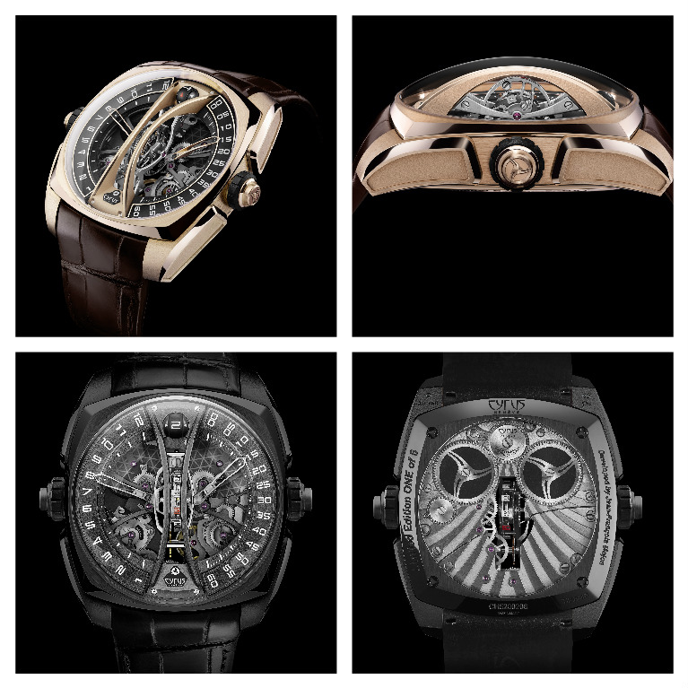 CYRUS – un grande progettista. J.F.Mojon, fondatore di Chronode, affianca questa produzione, dopo aver ideato per IWC il Calibro 5000, per Harry Winston l’Opus X, per MB&F the Legacy con Karl Voutilainen e l’elenco è ancora molto lungo. L’anno scorso Cyrus ha presentato il Klepcys Vertical Tourbillon manuale con il ponte ispirato a un disegno di Leonardo da Vinci. adesso è arrivata la versione squelette. La gabbia del tourbillon, al centro del quadrante, ruota in un minuto su un asse verticale con un’inclinazione di 90° per garantire la miglior precisione in qualsiasi posizione si trovi l’orologio da polso; ore e minuti si leggono a retrograde su semi archi, i secondi appaiono sulla gabbia del tourbillon e, a completare, a ore 12 c’è la riserva di carica; cassa a cushion mm 44 in oro rosa, oro e titanio o tutto titanio DLC black, quest’ultima è realizzata in 5 esemplari; A/h 21.600, 53 rubini, due bariletti in parallelo, bilanciere a inerzia variabile e un finissage adeguato all’alta orologeria.