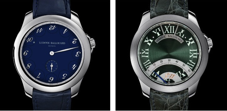 LUDOVIC BALLOUARD, maestro orologiaio dell’AHCI nato in Francia, ma formatosi professionalmente a Ginevra da Franck Muller e poi da F.P.Journe, ha ideato nel 2009, con il suo nome, una complicazione che mostra la sua personalissima idea del tempo. Upside-Down (a sinistra nella foto) focalizza l’attenzione sull’ora attuale con l’indicazione corretta mentre tutte le altre sono capovolte. A fianco il modello Half-Time, del 2012, ha gli indici tagliati a metà (solo il 12 è intero), le due metà si uniscono quando i due dischi rotanti indicano l’ora; altra ideologia nei colori scelti, verde ecologico e nero. Nel 2012 a Ballouard è stato chiesto di realizzare l’Opus XIII, attualmente sta studiando una nuova complicazione che dovrebbe essere pronta l’anno prossimo.