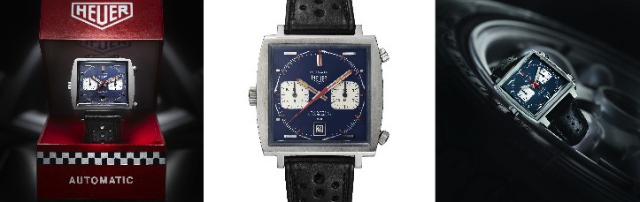 Nato nel 1969 (fu presentato a New York il 3 marzo di quell’anno) e voluto fermamente da Jack Heuer, che da tempo seguiva le gare in automobile (è stato il primo a sponsorizzare un pilota di F1, Jo Siffert), ha vissuto il suo “momento di gloria mondiale” al polso di Steve McQueen nel film sulla 24 Ore di Le Mans del 1971, ma la sua cassa quadrata, il quadrante blu e il movimento automatico, nato dalla collaborazione instaurata tra Heuer, Breitling e Hamilton (Zenith aveva seguito invece nel movimento del Primero la strada della cronografia integrata), hanno affascinato anche con i modelli che si sono susseguiti nel tempo; per esempio quello, a metà degli anni ’70, con la cassa nera anodizzata. Tre anni dopo il salvataggio della Heuer, diventata nel 1985 TAG Heuer, fu realizzato un nuovo Monaco e, facendo un salto veloce nel tempo, arriviamo al 2004 con il Concept Monaco V4 e il successo di questo cronografo continua a tutt’oggi nelle sue molte versioni; nella foto sotto quelle del 1969, del 1971 e del 2015.