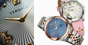 In febbraio però Versace Time ha messo in vendita Audrey Watch, forse perché come l’indimenticabile attrice il Jack Russel è elegante e a volte birichino? Comunque questo orologio è importante per due motivi: il Jack Russel che a ore 8 fa da contraltare all’iconica Medusa delle 12, è il cane di Donatella Versace, da non sottovalutare poi le borchie del guinzaglio e del collare incastonate sugli indici. Cassa rotonda in acciaio ø 38 mm bicolore o IP yellow gold, quadrante sunray bianco o celeste, fondello con numerazione progressiva, movimento al quarzo Ronda, bracciale o cinturino in pelle con motivo a fiore che riecheggia le stampa Floralmania della collezione SS19.