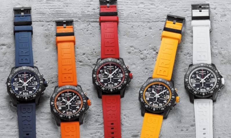 I nuovi Breitling Endurance Pro, accattivanti per i colori proposti, sono leggeri, resistenti, precisi (lo certifica il COSC). L’ultraleggera cassa nera, ø 44 mm, (peso 116,13 g), w.r. a m.100, è realizzata in Breitlight®, un materiale robusto 3,3 volte più leggero del titanio e 5,8 volte più leggero dell’acciaio inossidabile, senza contare altre qualità come l’essere amagnetico, termicamente stabile, ipoallergenico, resistente a graffi, trazione e corrosione; toccandolo si prova una sensazione più calda rispetto a quella data dal metallo; esteticamente si presenta come leggermente strutturato e per di più, come dichiara orgogliosamente la Maison, è un’esclusiva Breitling, al 100% Swiss made. I cinturini in caucciù colorato (blu, arancio, rosso, giallo, bianco) in coordinato alla scala pulsometrica sul quadrante nero, hanno la fibbia a doppio ardiglione, oppure si può scegliere anche un colorato cinturino NATO Outerknown in filo ECONYL®. Il movimento è il Calibro Breitling 82, cronografo Superquartz™ termocompensato certificato COSC che, con la cronografia a 1/10 di secondo, offre un’ottima precisione.