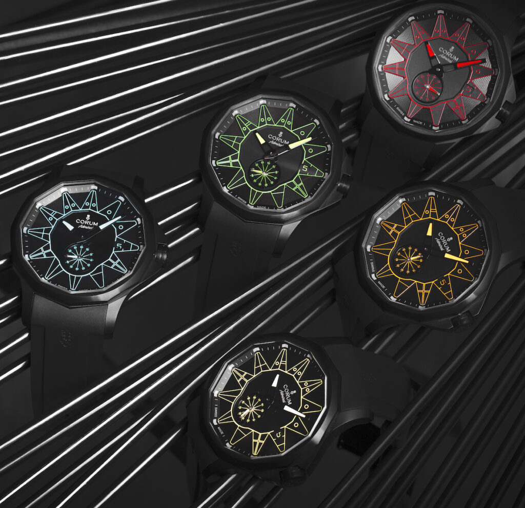 Oggi torniamo su ciò che abbiamo scritto di Corum nell’articolo “fidelizzare i fans”. La collezione Admiral 42 ha aggiunto molti colori sul celebre quadrante con i pennelli nautici (suggeriti dal distributore italiano Amedeo Medafolz e da Beniamino De Nardo negli anni’80), la cassa in acciaio è trattata anche in PVD nero (100 gli esemplari), il movimento è automatico. Infine l’Admiral AC ONE 45 offre la cronografia.