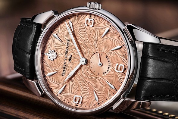 Cuervo y Sobrinos ha presentato una nuova versione riservata alle boutique, il nome ” Flameantes” si lega al bel quadrante color salmone decorato con un particolare guillochage ispirato da un segnatempo degli anni ’50.