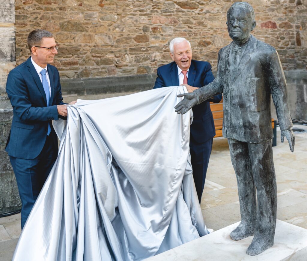 Il Sindaco di Glashuette Markus Dressler e Hartmut Knothe, che ha contribuito alla rinascita di A.Lange&Sohene, mentre inaugurano la statua dedicata a Walter Lange.