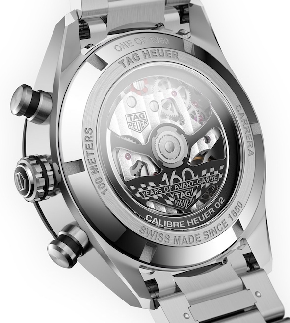 Due le versioni, una con quadrante silver e una con quadrante blu, cassa in acciaio ø 44 mm, lunetta in ceramica, per entrambi il movimento è il Calibro di Manifattura Heuer 02 visibile dal fondo in vetro zaffiro; la tiratura è di 1860 esemplari e sul fondello si legge “one of 1860” oltre a vedere le incisioni legate al 160° anniversario.
