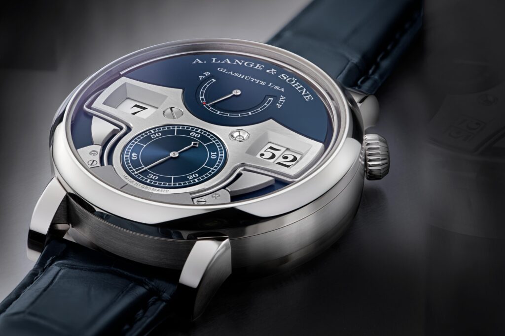 A.Lange & Sohene Zeitwerk con la ripetizione a dieci minuti e indicazione digitale saltante, cassa in oro bianco (prima era solo in platino) e quadrante blu profondo; edizione limitata a 30 esemplari