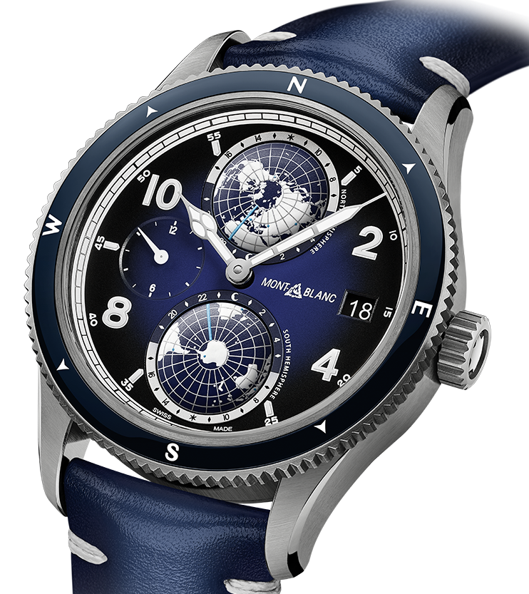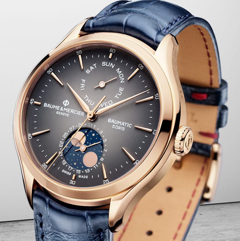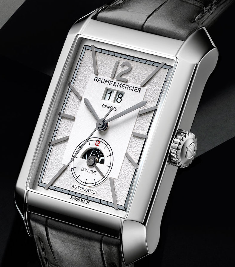 Baume&Mercier: Hampton Dual Time con movimento automatico e cassa in acciaio (nella collezione Hampton però ci sono anche segnatempo al quarzo) e. sotto, Clifton cassa in oro rosa con movimento Baumatic, data, giorno e fasi luna IWC collezione Portoghese in pole position con diverse versioni in acciaio o in oro, qui l’automatico in acciaio ø 40 o 42 mm con quadrante blu e, sotto, lo Yacht Club luna e maree con cassa in oro, ø 44,6 mm e quadrante blu. Sui loro movimenti il simbolo scelto da IWC nel 1903 “Probus Scafusia” garanzia della qualità LAURENT FERRIER, Marchio di nicchia, Gran Sport Tourbillon 12, pezzi, cassa in acciaio o 44 mm, movimento manuale, carica 80 h, A/h 21.600, cronometro, con il nuovo bracciale integrato MONTBLANC nella collezione 1858 Geosphere ora universale e i due emisferi girevoli, ha la cassa ø 42 mm in titanio e la lunetta in ceramica blu con i punti cardinali, Calibro di Manifattura MB 29 25; sotto il cronografo rattrapante Calibro di Manifattura MB 16 31 manuale con due ruote a colonna, cassa in titanio grado 5 o 44 mm quadrante in smalto grand feu, solo 100 gli esemplari