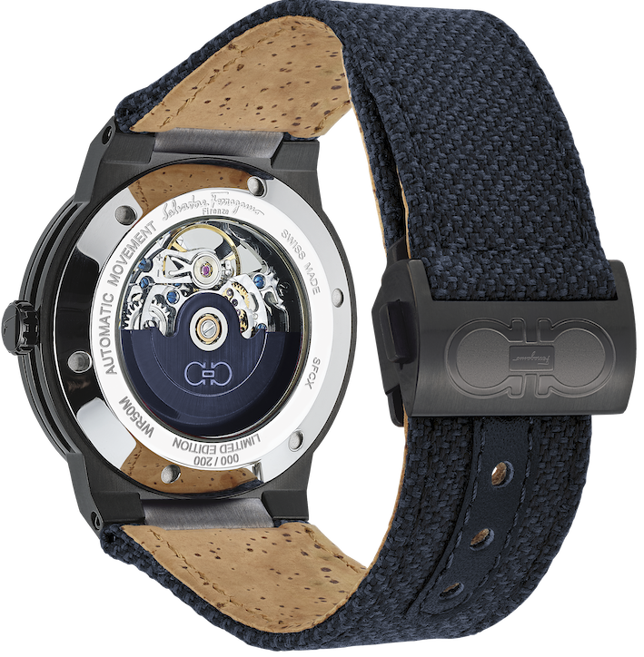 La scelta dell’aggettivo Sustainable si lega all’impegno dimostrato in questi anni dalla Marca per la salvaguardia del pianeta, impiegando materiali ed energie consone alle nuove conoscenze. Il modello F-80 è uno dei segnatempo Ferragamo di maggior successo; l’impresa, nata a Firenze, è poi stata acquistata da Timex Group che ne aveva apprezzato il valore storico oltre a quello dello stile, legato spesso a dettagli della sua iconica produzione di calzature e pelletteria; infatti sul quadrante questo squelette mostra l’iconico disegno del doppio Gancino, mentre il fondo in vetro zaffiro fa ammirare il movimento automatico. L’edizione è limitata a 200 esemplari per ogni versione.