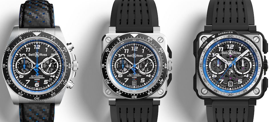 Nella foto partendo da sinistra, cassa Vintage 43 mm in acciaio w.r.a m.100, lunetta girevole bidirezionale, quadrante nero, movimento Cal.BR301 cronografo automatico, cinturino pelle o bracciale in metallo. Con la Cassa, 42 mm tradizionale degli orologi Belle&Ross, w.r. a m.100, il secondo, con cinturino caucciù nero traforato ed equipaggiato sempre con il calibro BR301. Tiratura per enrambi: 500 esemplari. Con la cassa ø 45 mm in titanio e ceramica con inserti in caucciù, w.r. a m.100, il terzo cronografo che monta il Cal.BR312 automatico con ponte superiore a forma di X, 56 rubini, 28.000 A/h, quadrante open worked, scala tachimetri sul réhaut, cinturino in caucciù; la tiratura è di 50 esemplari.