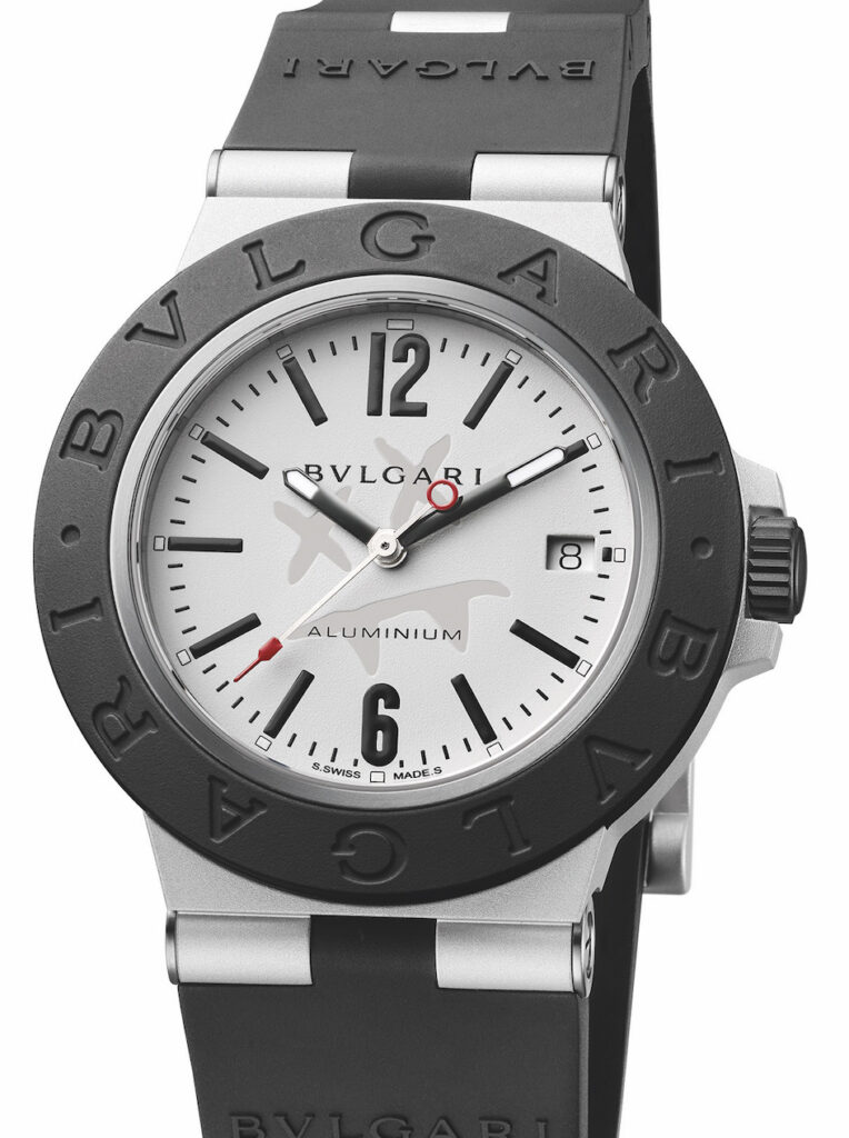 Bvlgari new self-winding Aluminium, tribute to famous DJ Steve Aoki: light steel case, rubber bezel and bright dial with Steve Aoki logo..
