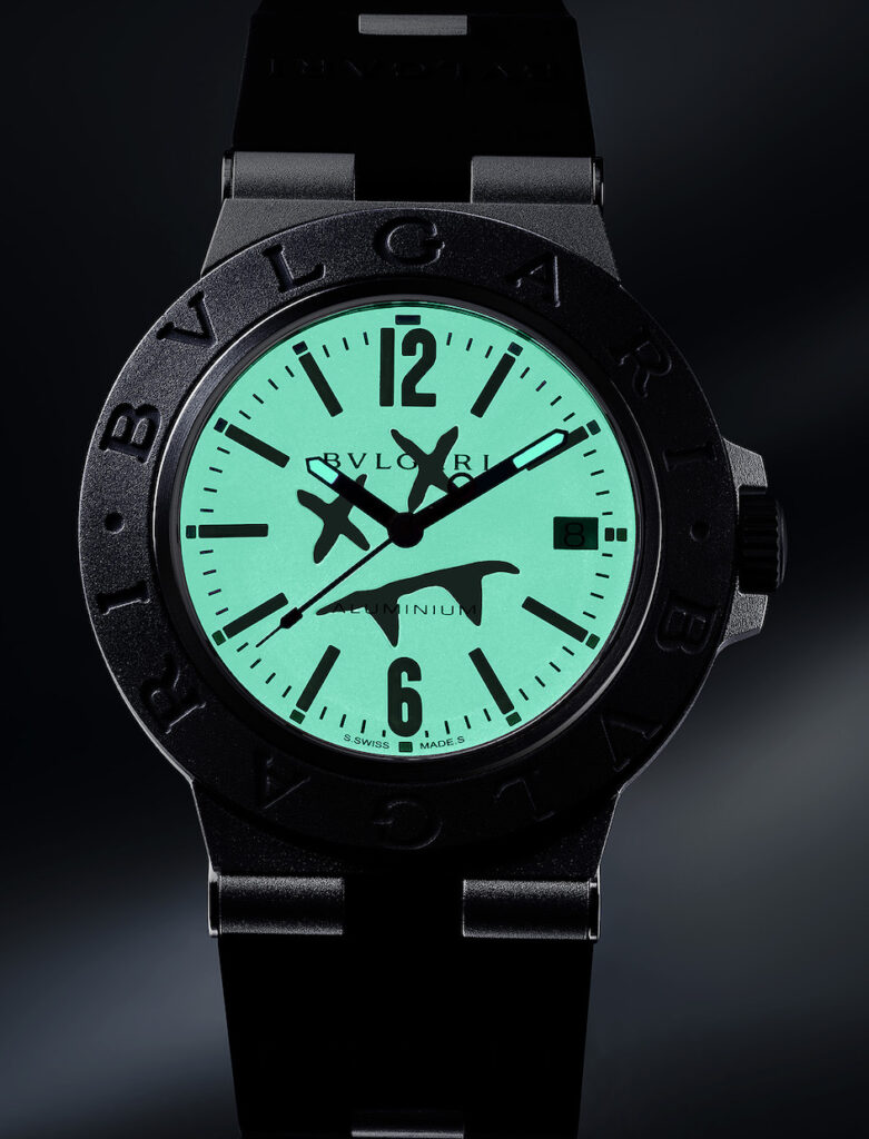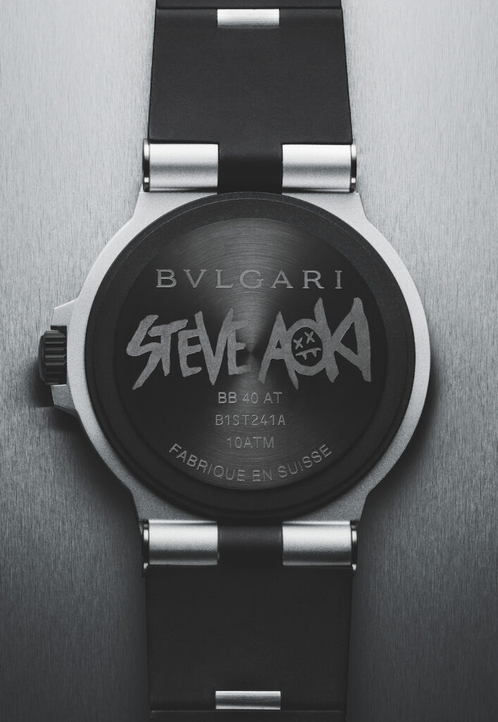 Queste le caratteristiche dell’automatico equipaggiato con il Calibro Bvlgari B77, cassa in alluminio ø 40 mm w.r. a m.100 trattata DLC, lunetta in caucciù, come il bracciale, che ha giunture e fibbia ad ardiglione in alluminio; sul fondello in titanio è inciso il logo Steve Aoki; quadrante bianco in Superluminova a lui dedicato; e che al buio, con la luminescenza verde, appare più visibile.
