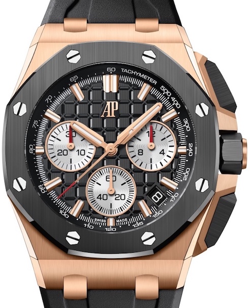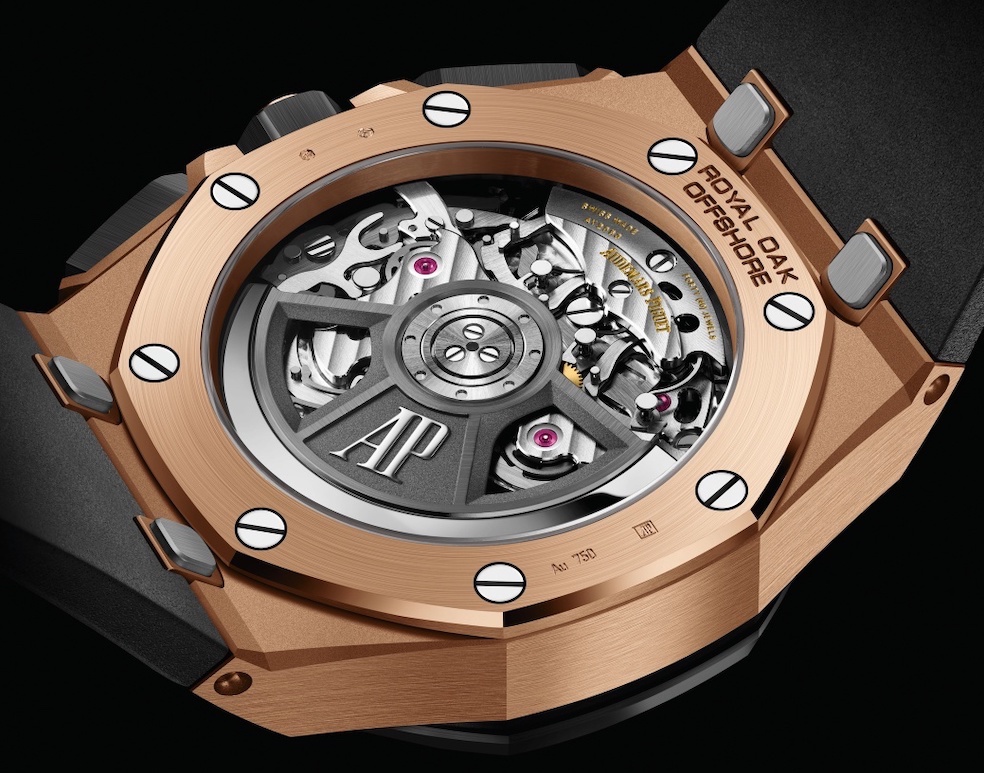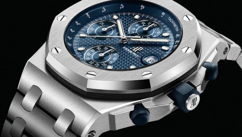 Il movimento cronografico integrato è il Calibro 4404 flyback con ruota a colonne accoppiata a funzionamento verticale. Sul quadrante, che riprende l’iconico disegno del Tapisserie dei primi anni ’90, il contatore delle ore è alle 12, quello dei secondi alle 6 e alle 9 resta quello dei minuti, Le versioni in acciaio e oro rosa hanno pulsanti e corona in caucciù blu e sempre in caucciù blu è la guarnizione che sigilla la lunetta alla cassa; nel modello in titanio questi elementi sono in caucciù nero. Mirata la scelta del colore per i quadranti, alla cassa in acciaio si affianca il quadrante blu del Royal Oak Offshore del 1993, colore che negli archivi di Le Brassus è indicato come “Night Blue, Cloud 50”, per la cassa in oro rosa il quadrante “Night Blue, Cloud 50” ha i contatori color oro rosa e per la cassa in titanio sul quadrante grigio chiaro spiccano contatori neri e un réhaut nero. Infine vicino alla data con la lente il logo AP in oro è applicato.