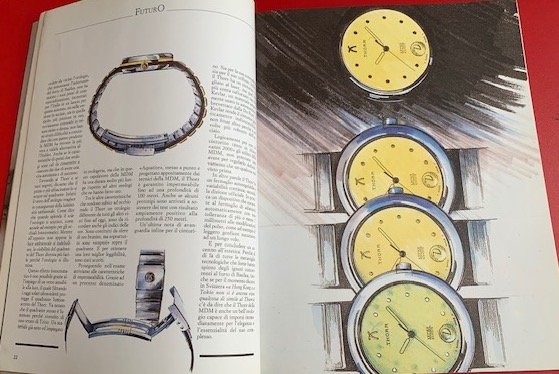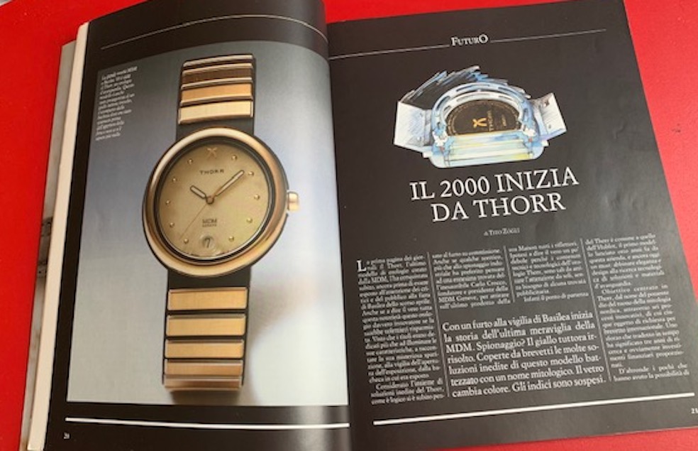 Era il Thorr di MDM che il giorno dell’inaugurazione della Fiera di Basilea (non ancora Baselworld) scomparve misteriosamente dalla vetrina dello stand. Furto su commissione o scelta ad arte di Carlo Crocco per attirare sull’orologio l’interesse di media e pubblico? Non lo si è mai saputo. Era una prima mondiale e anche se l’estetica lasciava a desiderare per il notevole spessore (per via del movimento al quarzo, tanto da farlo chiamare Thorrone) la caratteristica principale era il quadrante: quando la luce diminuiva si illuminava per far vedere meglio gli indici, sfere d’oro brunito che sembravano sospese sotto il vetro zaffiro.
