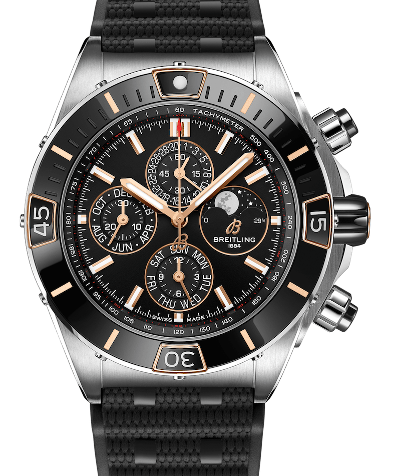 Questa la scheda tecnica del modello indossato da Brad Pitt che si è detto affascinato dalla funzione della luna. Cassa ø 44 mm in acciaio inossidabile e oro rosso (ma nella collezione sono presenti anche altre versioni) con inserti in ceramica su lunetta, pulsanti cronografici e corona, cinturino in caucciù liscio o intrecciato ispirato al bracciale Rouleaux in acciaio, movimento Calibro automatico Breitling 19 certificato cronometro, carica 42 h. rubini 38, A/h 28.800, cronografia a 1/4 di secondo con contatori dei 30 minuti e delle 12 ore; il calendario semiperpetuo deve essere regolato ad ogni anno bisestile, oppure ogni 1461 gg.