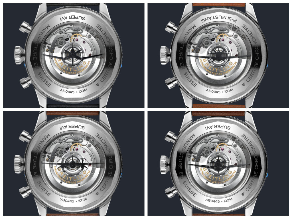 Per chi segue invece soloPolso che si occupa di orologi, diciamo che il movimento di questi cronografi con indicazione del secondo fuso orario (24 h sulla lunetta interna con la lancetta GMT dalla punta rossa) è il Calibro automatico di Manifattura B04, A/h 28.800, massa oscillante bidirezionale su cuscinetto a sfere, ruota a colonne, innesto verticale, cronografi a 1/4 di secondo, contatori 30 minuti e 12 ore, carica circa 70 h, certificato cronometro dal COSC. La cassa w.r. a m.100 è in acciaio o in oro, ø 46 mm, lunetta zigrinata bidirezionale, corona sovradimensionata a vite con due guarnizioni, fondo cassa avvitato e vetro zaffiro sul quale, stilizzati i tratti caratteristici dell’aereo. Quadrante antracite per la versione 46 P-51 Mustang; blu per la versione omaggio al Vought F4U Corsair; verde militare per la versione Curtiss P 40 Warwak e nero per quella dedica al De Havilland Mosquito.
