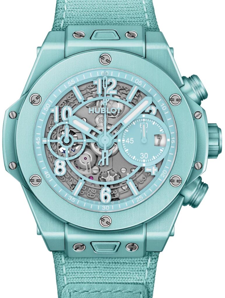 Ed ecco colori estivi anche per un Hublot Big Bang Unico Summer che si presenta in un tenero azzurro in un color turchese che ricorda le lagune. La cassa ø 42 mm è in alluminio anodizzato e satinato, turchese come le acque di una laguna. Secondo il marketing è un modello unsex, anche se per i polsi femminili un ø 42 mm è un po’ azzardato.