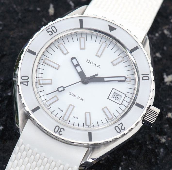 Come Doxa che, dopo i coloratissimi Diver w.r. a m.300, presentati questa primavera oggi per il Diver, w.r. a 200 metri, propone un quadrante in un bianco assoluto, bianco come la spuma delle onde o il colore delle perle, che si affianca ai colori già esistenti (argento, nero, arancio, blu, turchese e giallo). La cassa ø 42 mm è in acciaio 316L la lunetta è in acciaio unidirezionale con inserto in zaffiro, corona a vite; la completano un cinturino bianco in caucciù o un bracciale in acciaio con maglie a grana di riso. Movimento automatico svizzero, carica circa 38 h.