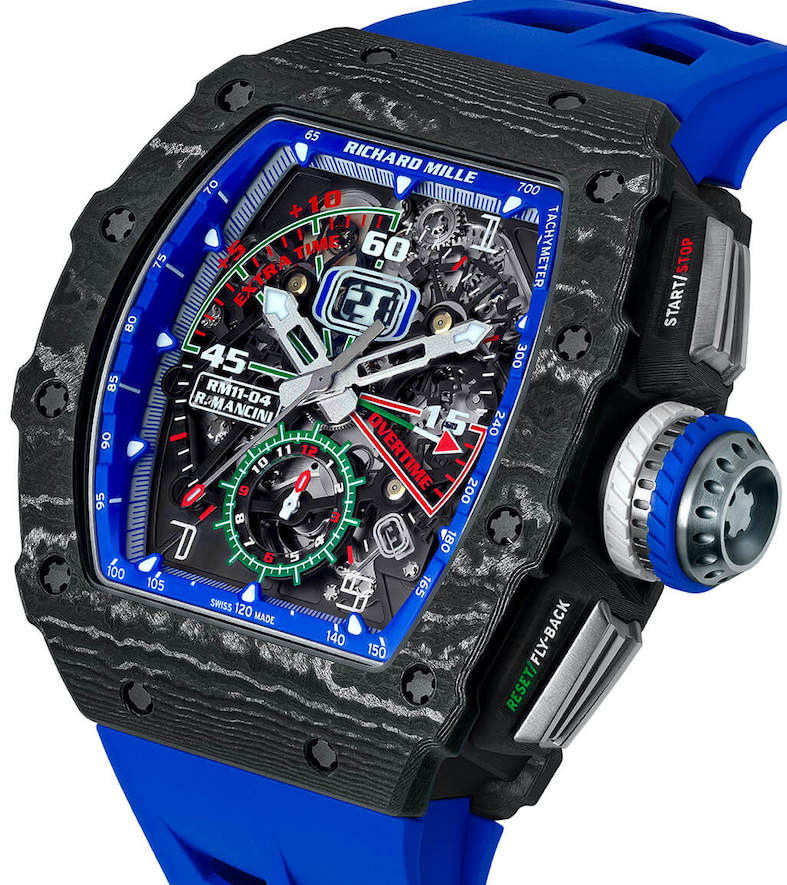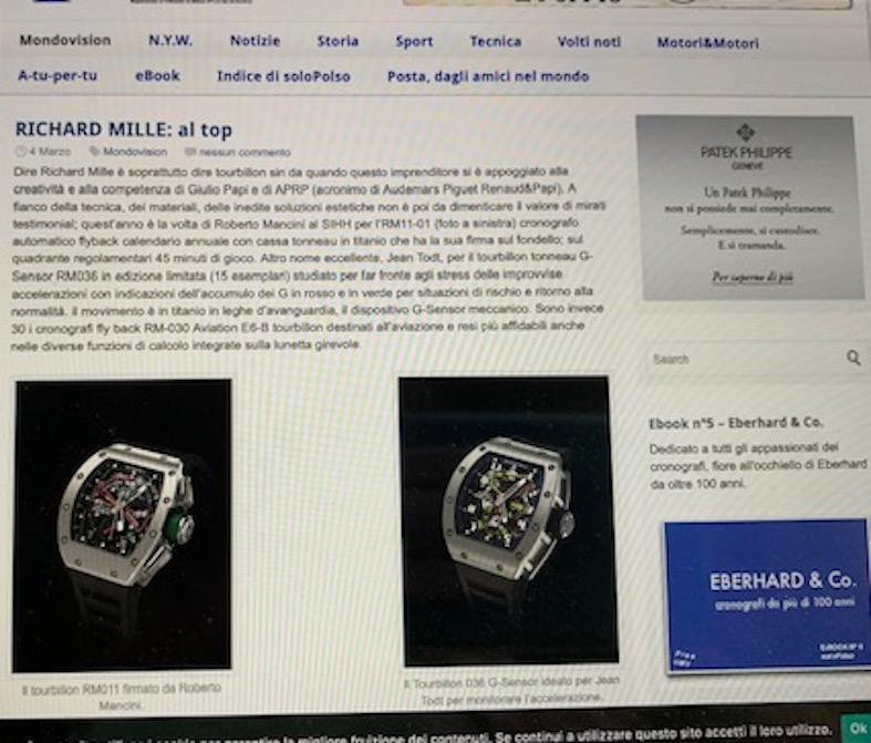 Per evitare di dover usare lenti da 10 o più diottrie trascriviamo qui quanto scrivemmo allora: “Dire Richard Mille è soprattutto dire tourbillon sin da quando questo imprenditore si è appoggiato alla creatività e alla competenza di Giulio Papi e di APRP (acronimo di Audemars Piguet Renaud&Papi). A fianco della tecnica, dei materiali, delle inedite soluzioni estetiche non è poi da dimenticare il valore di mirati testimonial; quest’anno è la volta di Roberto Mancini al SIHH per l’RM11-01 (foto a sinistra) cronografo automatico flyback calendario annuale con cassa tonneau in titanio che ha la sua firma sul fondello; sul quadrante i regolamentari 45 minuti di gioco. Altro nome eccellente, Jean Todt, per il tourbillon tonneau G-Sensor RM036 in edizione limitata (15 esemplari) studiato per far fronte agli stress delle improvvise accelerazioni con indicazioni dell’accumulo dei G in rosso e in verde per situazioni di rischio e ritorno alla normalità. il movimento è in titanio in leghe d’avanguardia, il dispositivo G-Sensor meccanico. Sono invece 30 i cronografi fly back RM-030 Aviation E6-B tourbillon destinati all’aviazione e resi più affidabili anche nelle diverse funzioni di calcolo integrate sulla lunetta girevole.”
