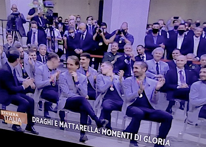 Concludiamo con una foto ripresa da una trasmissione TV che ci è piaciuta molto per la didascalia. In quanto al giro per Roma sull’Imperiale del bus, ci ha fatto venire in mente l’Arco di Tito e i condottieri romani che lo attraversavano con carri colmi di bottini preziosi, oggi sul bus c’era solo una Coppa, ma molto preziosa, anche per chi al calcio preferisce sci, tennis o F1, perché è riuscita a far emergere quello che si chiama gioco di squadra e orgoglio nazionale che si era perso e che Roberto Mancini e i suoi ragazzi hanno saputo ricreare.