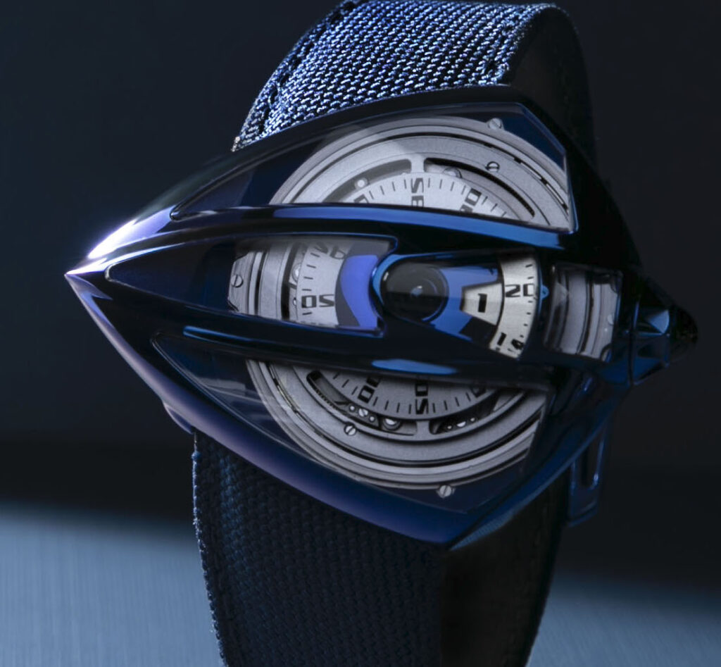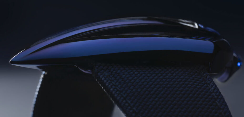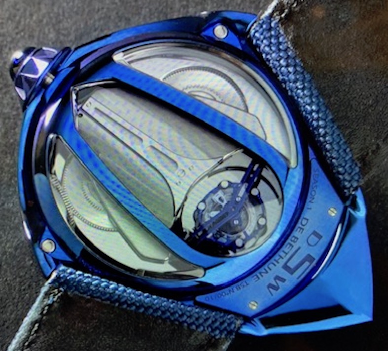 Esteticamente può ricordare con la forma a ogiva un’astronave, sicuramente è ancora più futurista delle più avanzate Dream Cars e dei precedenti quattro Watch Dream; ci si potrebbe anche aspettare, che una volta aperta la cassa in titanio con inserti in zaffiro blu (mm 47 x 58, spessore 17 mm) e corona con zaffiro blu, invece dei ruotismi apparissero dei piccoli marziani. L’esperienza fatta da DB con il vetro zaffiro (sono nate nel 2008 le prime lancette DB in questo materiale trasparente profilate in titanio blu e nel DB28 sono stati in vetro zaffiro i coperchi del bariletto) ha portato a una cassa con carrure trasparente e fondo a vista per ammirare il movimento a carica manuale Calibro DB2149 con scappamento a Tourbillon, la cui gabbia ultra leggera, in silicio (come la ruota dello scappamento) e in titanio, ruota in 30 secondi mostrando i secondi continui; le Ah sono 36.000, i componenti 356, i rubini 35, il bilanciere in titanio (brevetto DB del 2016) ha inserti in oro bianco, il doppio bariletto garantisce 4 gg di carica.