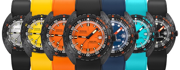 Facendo un passo indietro nella storia orologiera, ricordiamo infatti per i neofiti, che il primo Doxa subacqueo risale al 1967. Nel 2015 fu proposto in nero, silver e arancio, dando vita a una vera “orangemania”. Oggi la collezione degli automatici Sub 300 Carbon, ø 42,5 mm, Swiss Made e certificati cronometri del COSC, propone sei colori e dieci versioni, disponibili anche sul sito web della marca. Sulla lunetta è indicata la scala per le immersioni con numeri nei colori del quadrante.
