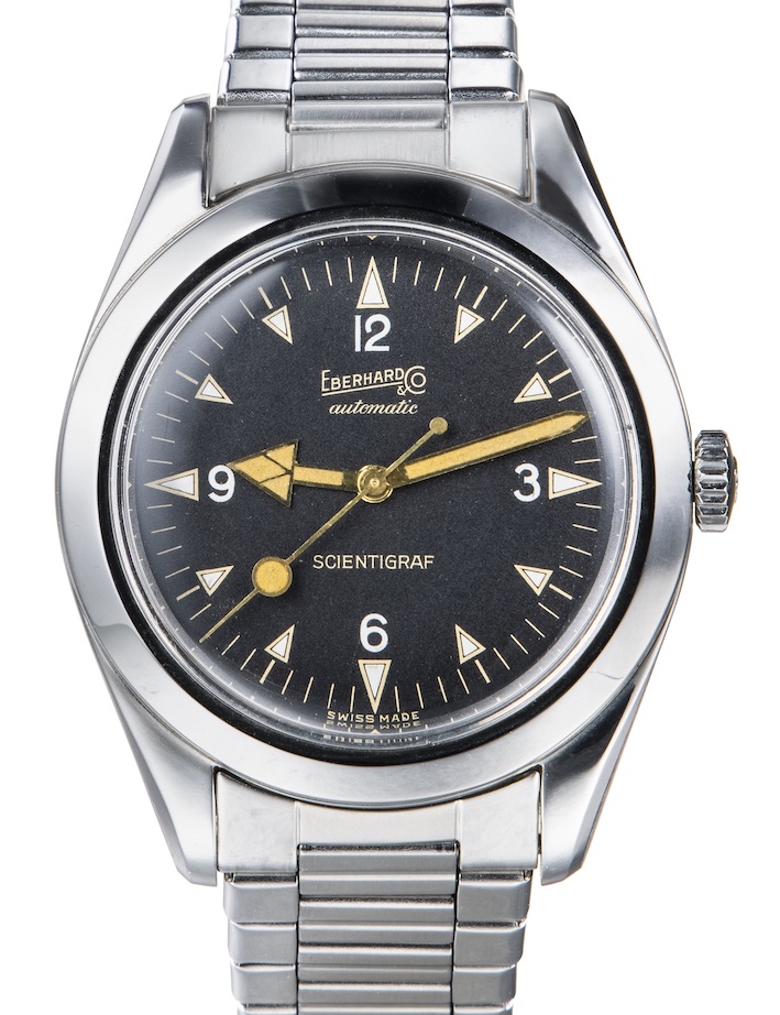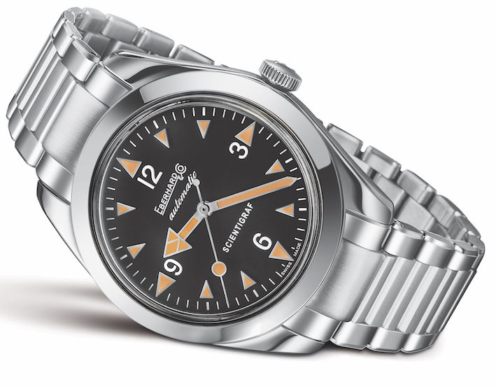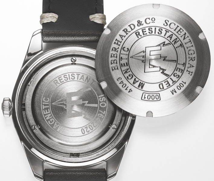 Queste le caratteristiche tecniche del nuovo orologio con il movimento Calibro SW 300-1 a carica automatica. La cassa in acciaio ø 41 mm w.r..a m.100, lavorata con doppia finitura lucida e satinata, è dotata di una gabbia metallica a protezione dalle onde magnetiche secondo la normativa ISO, sul fondo a vite il logo d’epoca è al centro con il disegno del modello originale nel 1961 e la scritta Magnetic Resistant Tested. Il vetro zaffiro trattato antiriflesso, è scavato e bombato. Il quadrante nero opaco lavorato a galbé, ha due tipi di luminescenza degli indici: vintage/verde o arancione ed è luminescente anche la zona circolare che si irradia dalla lancetta dei secondi. Infine si può scegliere lo Scientifgraf sia con il cinturino in pelle nera con inserto in cordura beige e fibbia personalizzata dallo scudo Eberhard, oppure con il bracciale in acciaio Chassis®.
