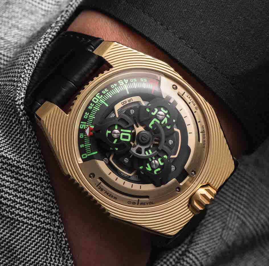 A new version of UR 100 Electrum, gold and silver, a special bezel and Calibre showing not only time but also distance covered by Earth at Equator and revolution around the sun.