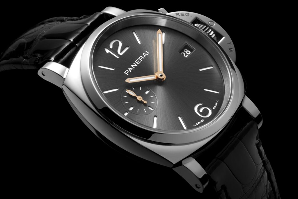 Un colore antracite profondo è stato scelto per il PAM01247, dal quadrante a sandwich e dalla finestrella della data; indici e lancette (queste con finitura dorata) sono luminescenti con Super-Luminova bianco che nel buio assume tonalità verdi, la finitura spazzolata rivela gradazioni inaspettate quando la luce si muove sulla sua superficie.