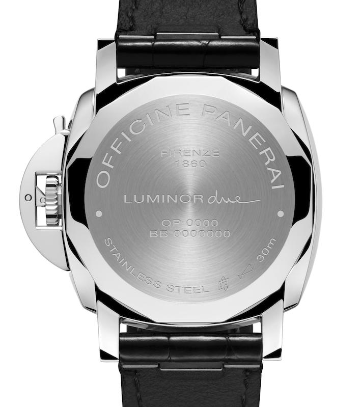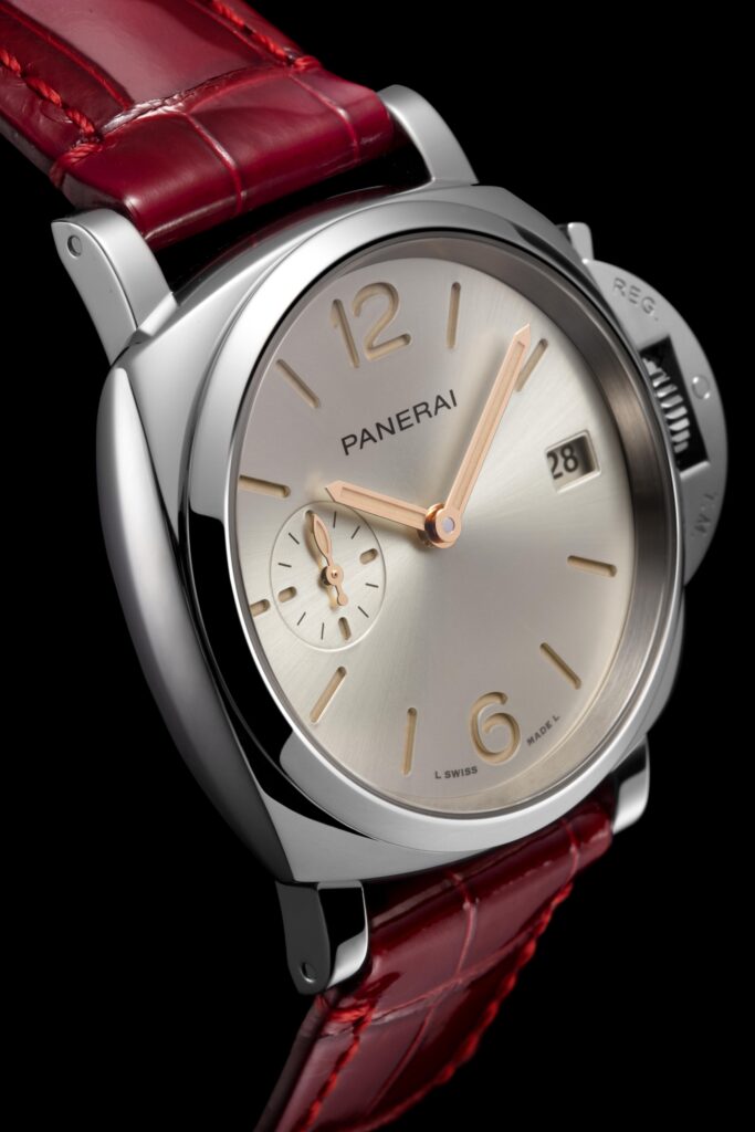 Il Luminor DUE fa l’occhiolino ai polsi femminili ai quali il diametro di mm 38 si adatta perfettamente, per il resto tutto è uguale al modello maschile, a partire dal dispositivo brevettato di blocco di sicurezza della corona.