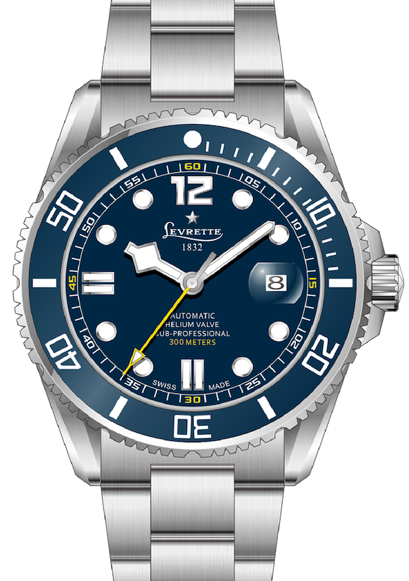 Destinato agli amanti del mare il Levmaster SUB 300 con valvola per il gas elio è ispirato ad un modello degli anni ’50 con cassa in acciaio ø 43 mm w.r. a m.300, corona a vite zigrinata che, con la lunetta unidirezionale antioraria con 120 scatti, ne fa un modello professionale; il quadrante è nero o blu, il vetro zaffiro trattato antiriflesso all’interno, ha la lente di ingrandimento sulla data a ore 3. Il movimento automatico è il calibro Sellita SW 200, A/h 28.800, 26 rubini.