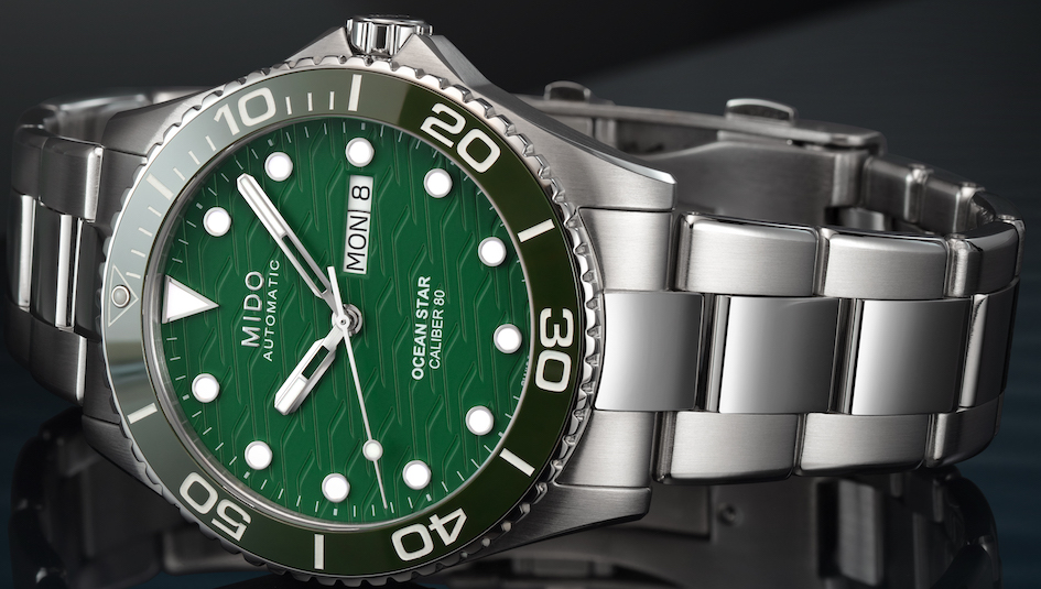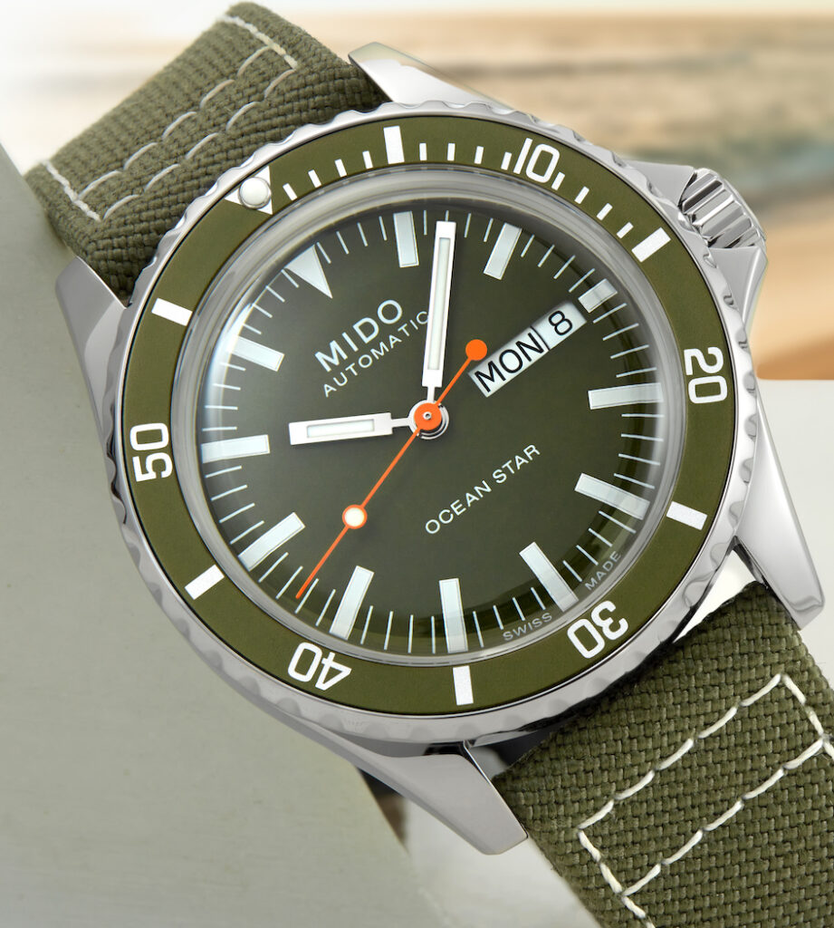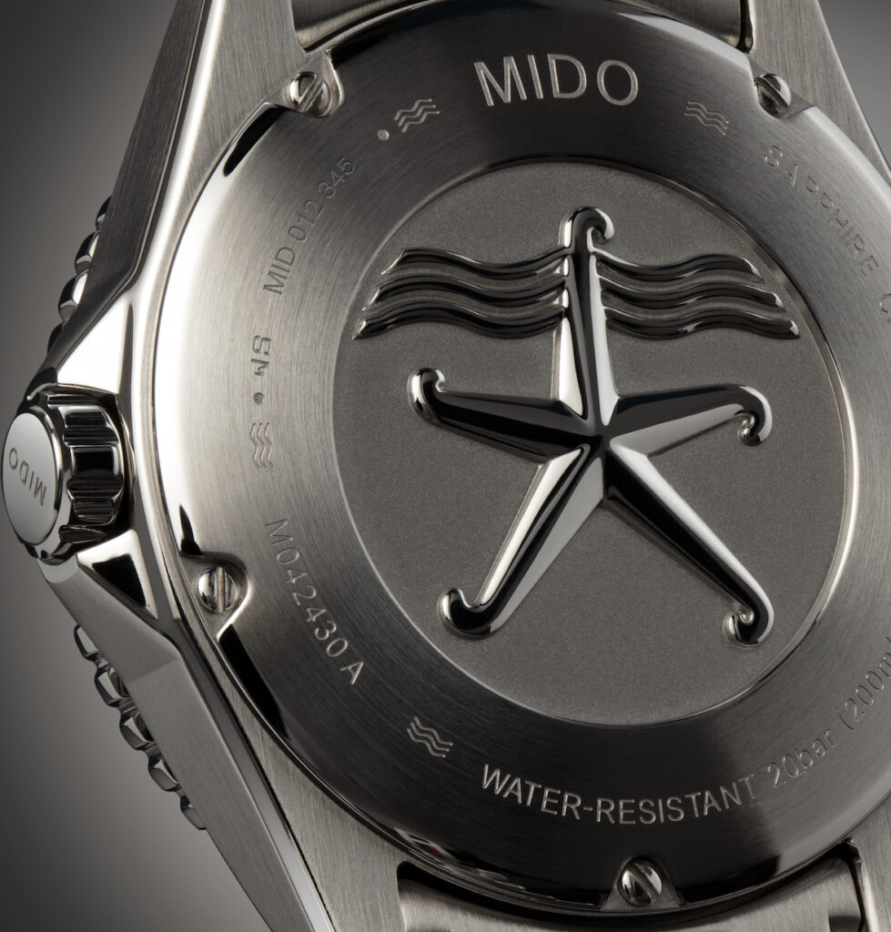L’Ocean Star Tribute si ispira all’estetica degli anni ’60 e privilegia il colore khaki su quadrante, ghiera in alluminio e cinturino, ricordando come Mido sin dagli anni ’30 fosse definito il Re degli orologi impermeabili.. Oggi la cassa in acciaio ø 40,50 mm è w.r. a m.200, ha il fondo pieno a vite come la corona ed è decorato con una stella marina a rilievo e reca il numero di serie. Il movimento automatico è il Calibro 80 su base ETA C07.621, A/h 21.600, rubin i26 rfinemente decorato e che garantisce una carica di 80 h.